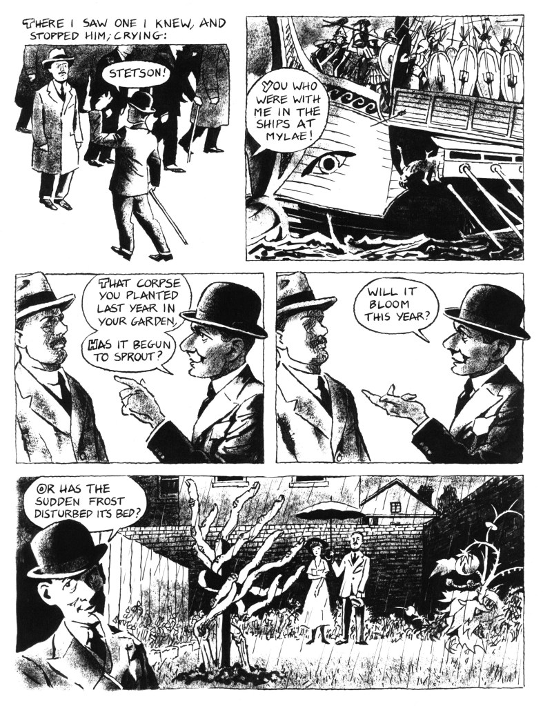 At long last, here is the final page of my comics adaptation of “The Burial of the Dead,” the first section of T. S. Eliot’s epochal poem “The Waste Land” (Click on image to enlarge).