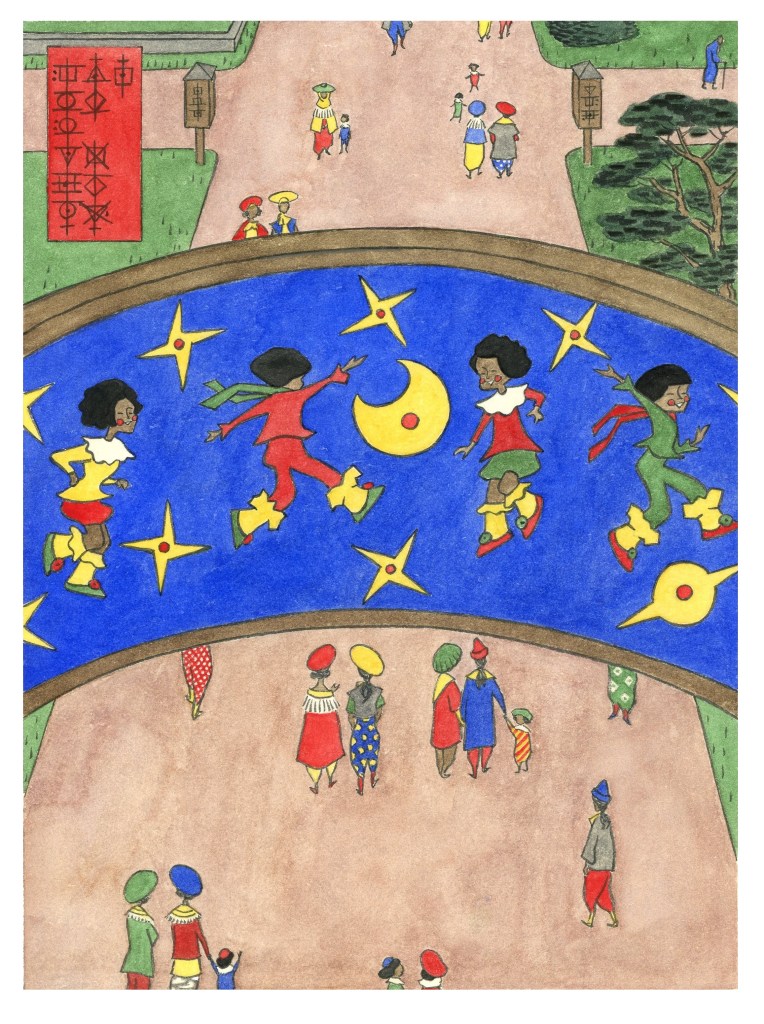 Marking this entrance is a wooden arch supported by two stone pillars. Running along the arch is a painted frieze depicting little girls and boys at play against a star-studded blue background. In this print, the artist has placed the frieze at the very centre of the composition, as though to call special attention to it. This may seem surprising, given that the painting would appear to be of little intrinsic aesthetic interest—an assemblage of generically ebullient child figures in conventionalized poses, executed in a popular commercial style from fifty years ago. The bright, primary colours are typical of that era as well, although the pure ultramarine background is perhaps somewhat unusual (It should be noted, however, that the painting is in reality far more faded and weatherworn than as depicted here). The way in which the children seem to be running and jumping amid a wholly immaterial landscape composed only of sky, stars, and planets, can also perhaps be momentarily arresting. Such cosmic playgrounds were also very much an aesthetic trope of the period, however, almost to the point of cliché.
