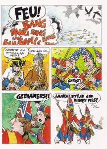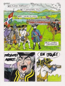 The Battle of the Plains of Abraham as a food fight. I proposed this comic for the annual comics competition organized by Hachette Canada, whose theme this year was “food”. I unfortunately did not win, but the creation of these pages did give me a valuable opportunity to experiment with colour, and with a more cartoony style. In the remainder of the comic, the French and British were to launch numerous other characteristic food items, including french fries, “ragout de boulettes”, cheddar and haggis (courtesy of the Fraser’s Highlanders). In the end, among the smouldering (and delicious) battle debris, poutine was to be discovered.