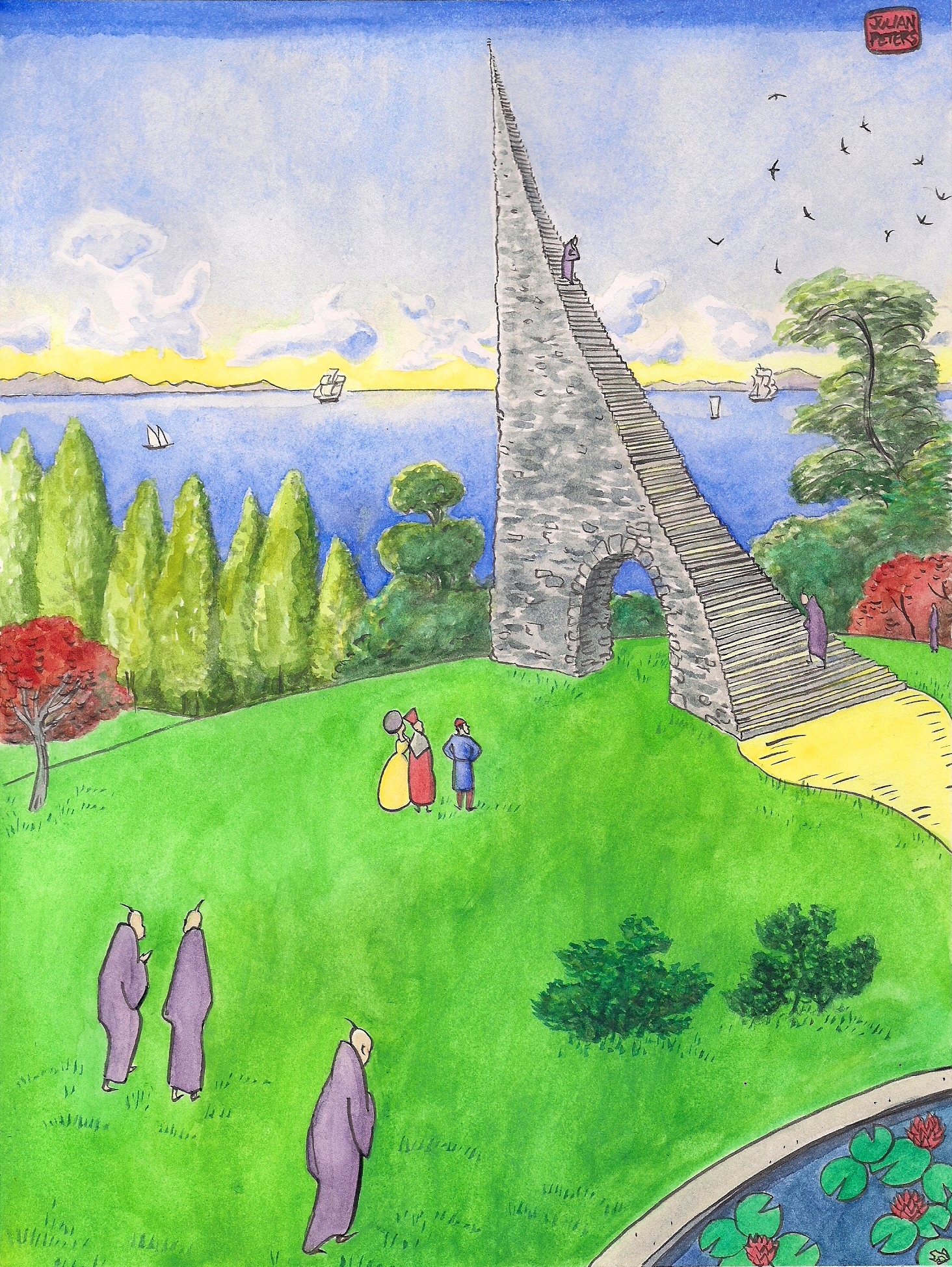 Sensuka is a city of many religious orders, and contains within its limits an incredible number of sanctuaries, convents, monasteries, and missions. The monastery of Tanalisca is among the most famous of these, owing to the bizarre structure that rises in the middle of its extensive grounds, known colloquially as “the stairway to nowhere.” This towering stone construction is indeed a staircase, albeit one with the curious peculiarity that the steps, which are quite wide at the base, get progressively narrower as they go up, to the point that the last step, which faces onto a seventy-foot drop, is barely wider than a thumbnail.