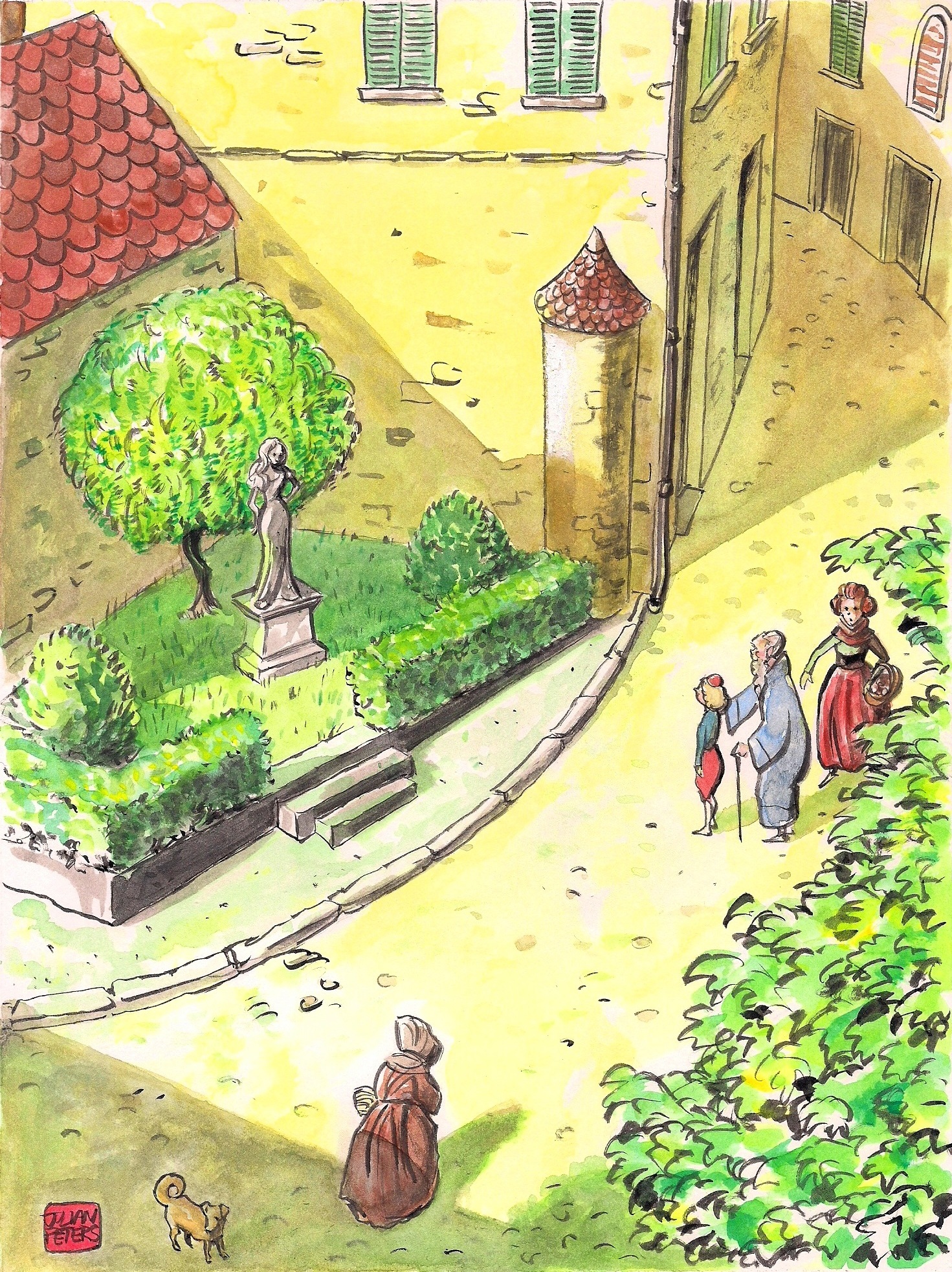 It is not uncommon in the older neighbourhoods of Sensuka to come across a narimoa, a monument to a local beauty. The majority of these statues were created around a century and a half ago, when the Emperor Bulodi III decreed the formation of neighbourhood councils to oversee the day-to-day affairs of the city’s various subdivisions. This development led to a renewed sense of neighbourhood pride, which in turn led to the widespread desire in each district to erect civic monuments that would testify to this sense of local belonging. The content of these monuments was left to the district councils, which were naturally composed mainly of old men. It was therefore inevitable that one of the local deliberations on this matter should conclude with the misty-eyed recollection of a particular local beauty who had driven the council members to distraction during their youth. Thus it was decided to erect a statue representing this girl, who had died or moved away long ago, as a kind of embodiment of everything the men held dear about their small corner of the city. This charming idea could not fail to catch on, and soon almost all of the local districts had their own narimoa (“local love”), as these statues came to be called, immortalizing their own fondly-remembered enchantresses. These narimoa, the products of a peaceful and generally happy –if at times somewhat melancholy- era, went out of fashion following the Seventeen Years War, after which time commemorative monuments to slaughtered young men became the preferred signifiers of local community spirit.
