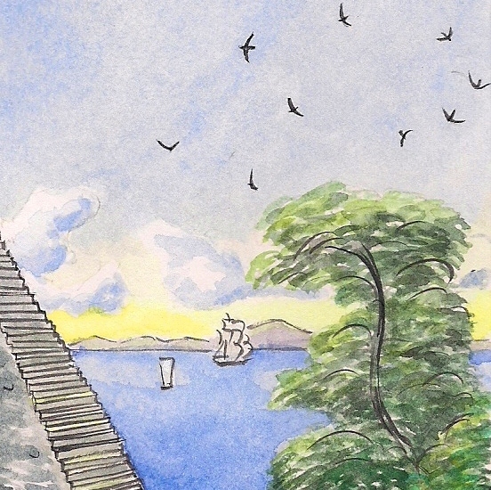 The Montreal poet and writer Alice Elm has written a stunningly beautiful poem, in French, that is directly inspired by my on-going “Views of an Imaginary City” series. The name of my invented city, which gives its name to this poem, is derived from the German word Sehnsucht, a difficult-to-translate term describing a very particular (and yet at the same time very vague) kind of existential longing. According to Wikipedia, Sehnsucht is “sometimes felt as a longing for a far-off country, but not a particular earthly land which we can identify. Furthermore there is something in the experience which suggests this far-off country is very familiar and indicative of what we might otherwise call ‘home’.” Alice has captured this feeling perfectly, and taken it quite a few steps further, or deeper, than I could ever have done, plunging into what I can now regard as a shared memory of a non-existent homeland, in a non-existent city, by a non-existent sea.