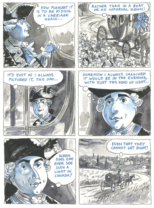 I am currently at work on a graphic novel recounting the siege of Quebec and the Battle of The Plains of Abraham in 1759. After drawing out a 60-page sample section in pencil, I have begun the process of inking and applying watercolour to it. This is the first completed page, featuring the Marquis de Montcalm, commander of the French army in North America.