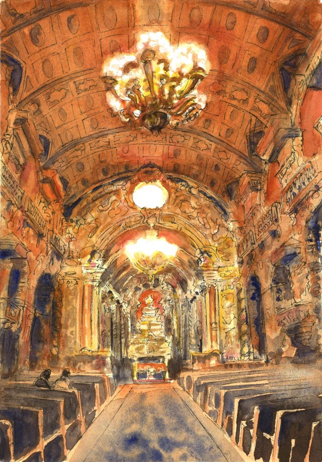 A watercolour of the interior of the Benedictine convent of Sao Benito in Rio de Janeiro, Brazil. Based on a photograph by Bernard Hermann.