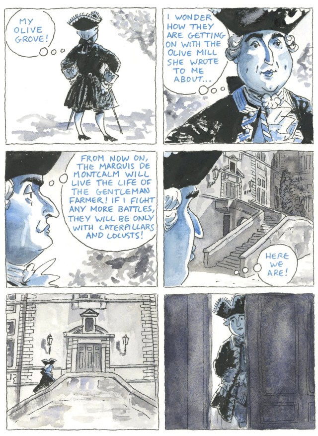 In this section, the French commander at the siege of Quebec, General Louis-Joseph de Montcalm, finally returns to his beloved chateau of Candiac, in Languedoc. To fully understand this scene, it is necessary to know that just before the beginning of the siege, Montcalm received the tragic news that one of his four daughters had died. Although from across the Atlantic Montcalm was not able to find out which one, he assumed it was his youngest, Mirète, who had long been sickly.