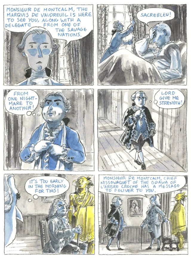 One of the parameters I set for myself with the colouring was that all the characters from a particular nation would be depicted in a combination of a neutral grey tone and one characteristic colour -blue for the French, red for the English, purple for the Haudenosaunee (Iroquois), and so on. Similarly, the colour of the lettering in the speech bubbles indicates what language is being spoken. Chief Nissowaquet of the Odawa of l’Arbre Croche appears in yellow, a decision based on the background colour of the present-day flag of the Little Traverse Bay Bands of Odawa, within whose reservation boundaries the village of l’Arbre Croche was situated.