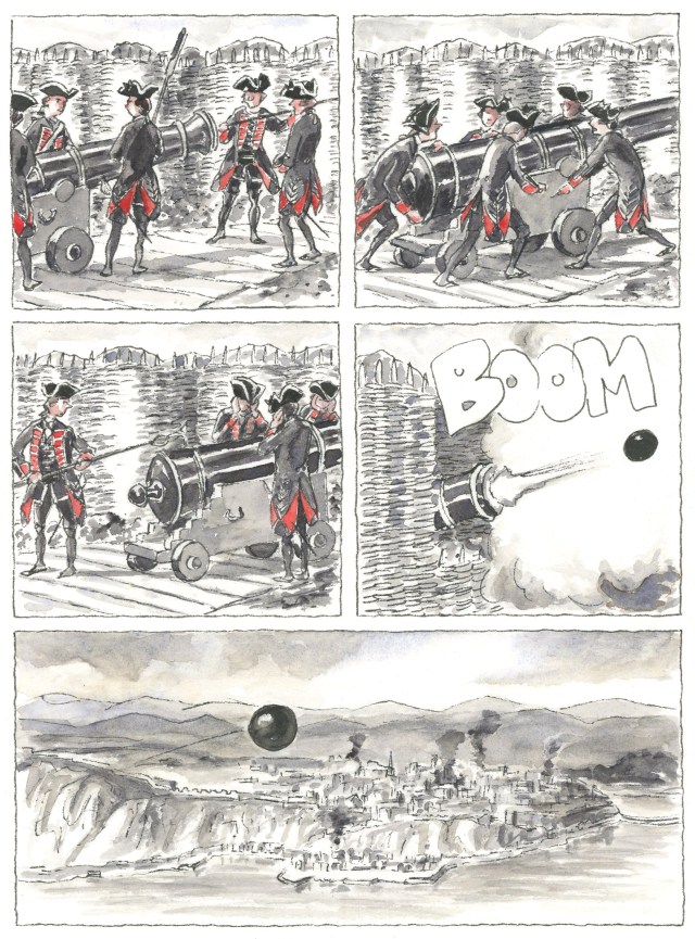 Here are two pages from “Each in His Narrow Cell,” my ongoing graphic novel project recounting the siege of Quebec and the Battle of The Plains of Abraham in 1759. All the characters from a particular nation are depicted in a combination of a neutral grey tone and one characteristic colour -blue for the French, red for the English, purple for the Haudenosaunee (Iroquois), and so on.