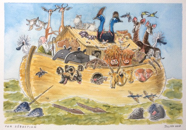 I created this watercolour painting as a recent baptism gift for my godson. Since my godson is genetically predisposed to becoming a wide-ranging and unconventional thinker, I decided that my depiction of Noah’s ark would eschew the usual elephants, lions, and zebras in favour of some of our less well-known fellow earthlings. Depicted aboard and around the vessel are: black-billed spoonbills, flying squirrels, gerenuks, capybaras, wooly bear caterpillars, mushushus, pig-nosed frogs, cassowaries, jerboas, pink fairy armadillos, long-eared bats, okapis, budgerigars, tamanduas, tarsiers, Highland cattle, pangolins, echidnas, Malayan tapirs, African wild dogs, star-nosed moles, saigas, proboscis monkeys, flying fish, elephant seals, sawfish, narwhals, and a human.