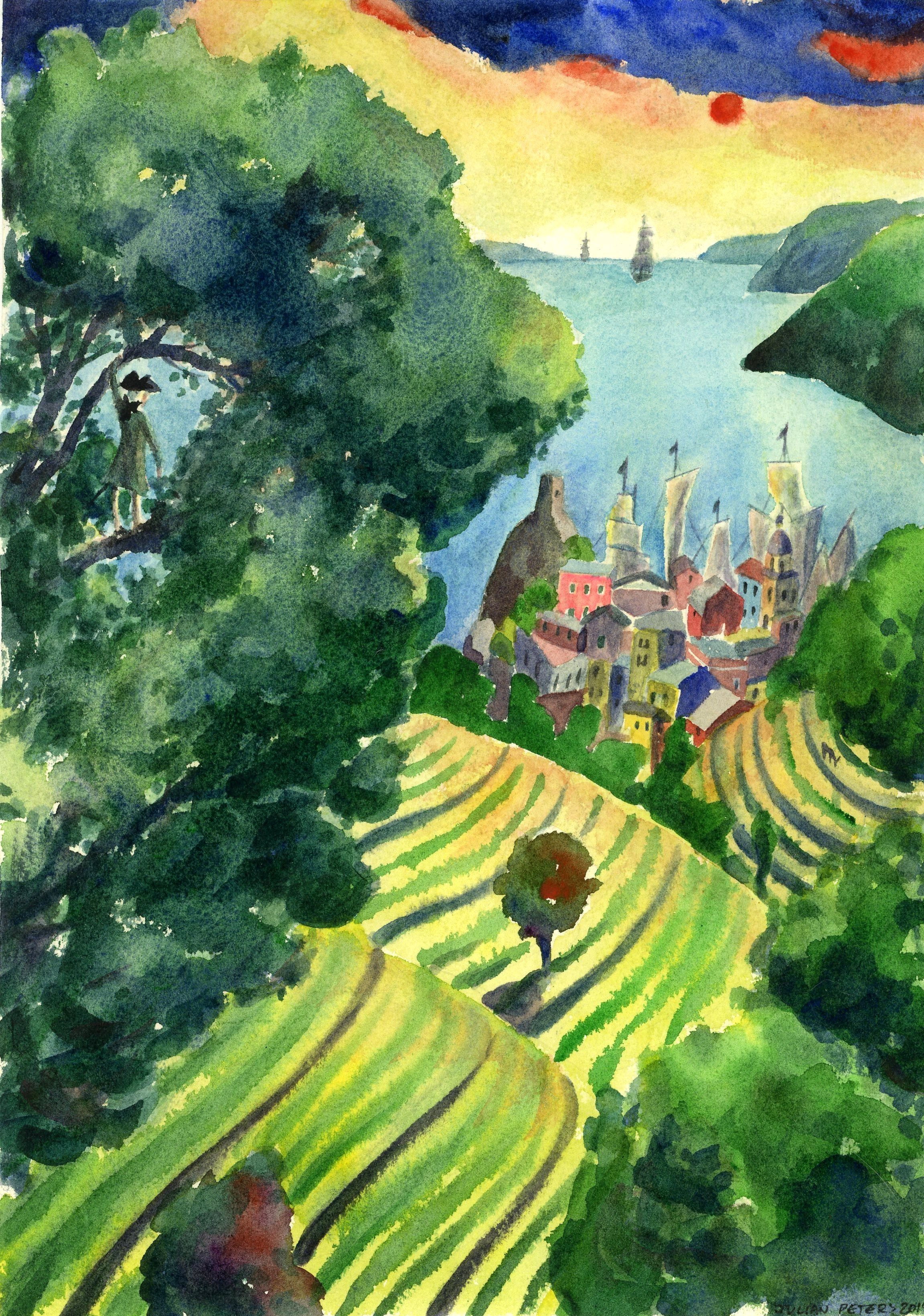 “Cosimo was in the oak. The branches were waving, high bridges above the earth. A light wind was blowing; it was sunny. The sun shone among the leaves, and to see Cosimo we had to shield our eyes with our hands. Cosimo looked at the world from the tree: everything was different seen from up there, and that was already an entertainment. The avenue had a completely different prospect, as did the flower beds, the hydrangeas, the camellias, the small iron table where one could have coffee in the garden. Farther on, the foliage thinned out and the vegetable garden sloped down in small terraced fields supported by stone walls; the low hill was dark with olive groves, and behind, the built-up area of Ombrosa raised its roofs of faded brick and slate, and ships’ flags peeked out from the port below. In the background the sea extended, high on the horizon, and a slow sailing ship passed by.”