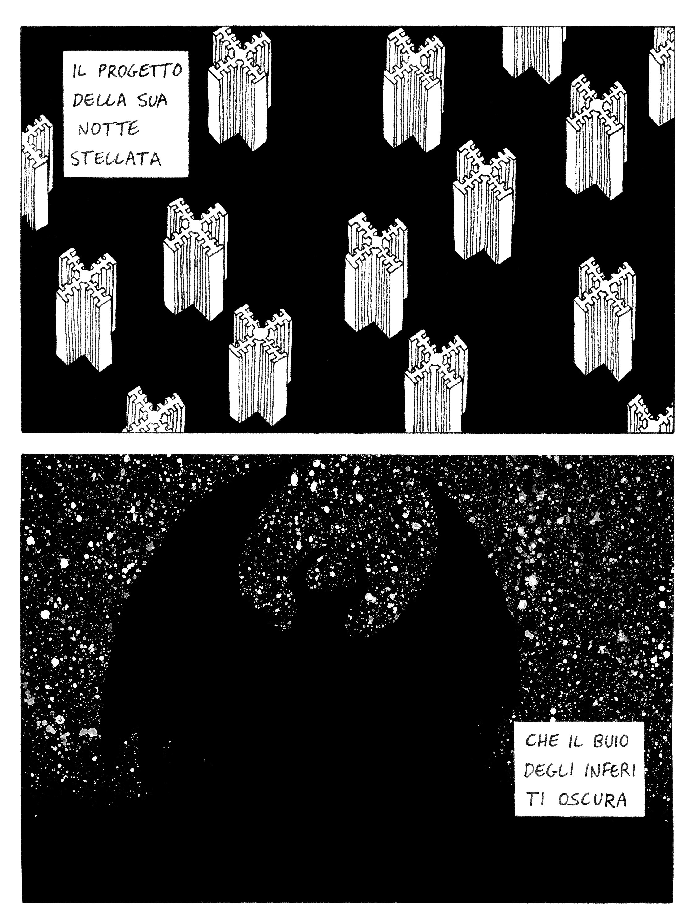 My adaptation of comics of a poem by the Italian poet Vincenzo Mascolo. The poem represents a section of a long poetic cycle (still in progress) titled “Orphée,” which is in turn inspired by the modern classical album of the same name by the Icelandic composer Jóhann Jóhannsson. Besides the classical myth of Orpheus, the passage I illustrated alludes to T. S. Eliot’s “The Love Song of J. Alfred Prufrock,” the “Ville radieuse” project of Le Corbusier, the three Italian Renaissance paintings of “The Ideal City,” Italo Calvino’s Invisible Cities, and Dante’s Inferno (and possibly others that I didn’t pick up on!). All in a few short lines. (Scroll down to the end for an English translation)
