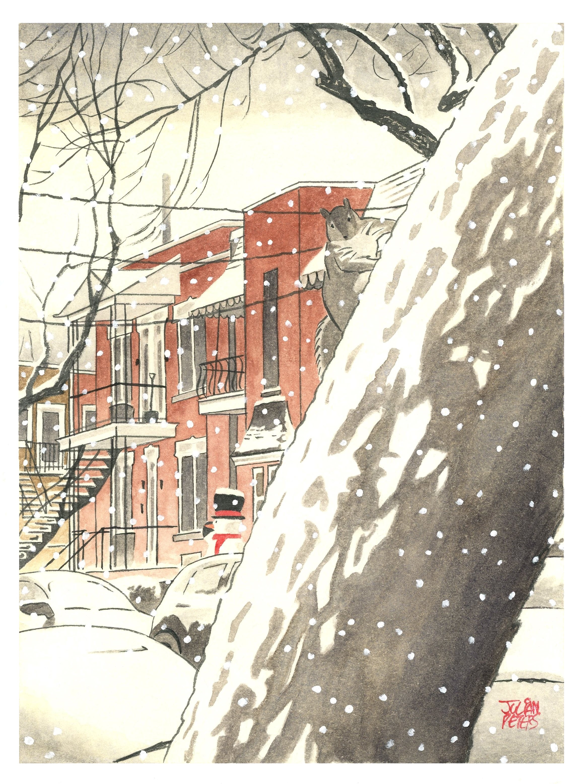 This watercolour was commissioned by the Montreal financial services firm ASSURART Inc. for their 2020 company holiday card. It was very much inspired by the magical winter scenes by the Japanese printmaking artist Hasui Kawase (1883-1957). Although the image is based on photographs that I took on rue Champigny in the neighbourhood of Côte-Saint-Paul near where I live, I had to add quite a bit of snow, as we’ve had so little of it so far this year.