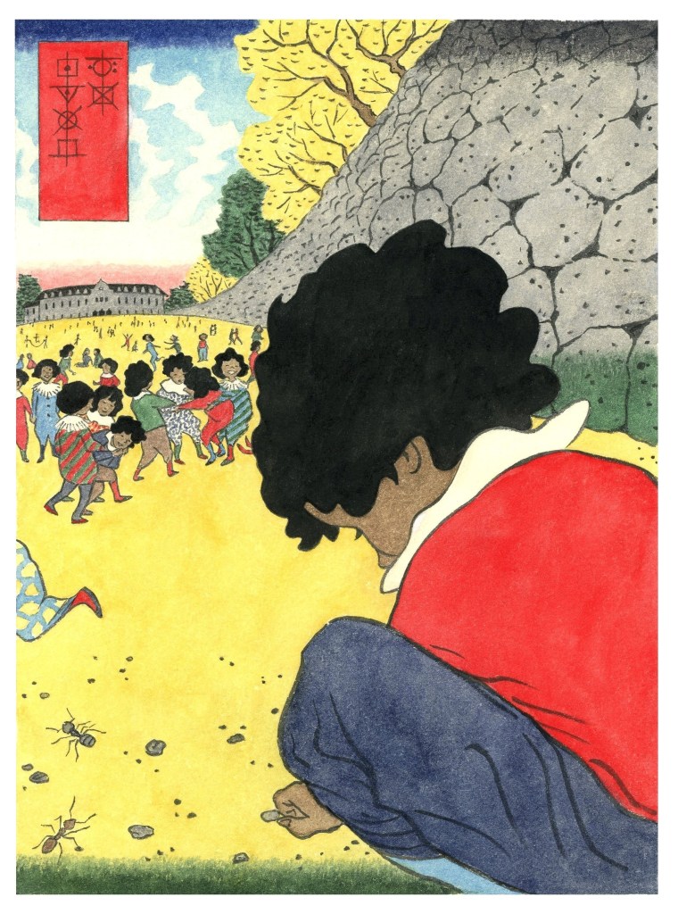 Not only time but space too appears dilated when one is a child, and by a far greater factor than can be accounted for simply by one’s smaller size. In this view of the schoolyard surrounding the Kadilutopla, the artist alludes to this childhood perception of the world by wildly distorting the scale of the depicted elements and of the distances between them. The main school building in the background is so far away that its ground floor is partially hidden under the horizon, while the drystone fence around the perimeter of the schoolyard soars towards the sky like a mountain ridge. For the child in the foreground of the image, from whose vantage point we are observing the scene, this far corner of the schoolyard constitutes a curious little world unto its own: The beaten earth surface contains a variety of interestingly shaped pebbles offering themselves up for solitary play, and there are several species of ants to watch deftly weaving their way through the uneven terrain as they scuttle about their inscrutable errands. The patches of moss in the moist and cavernous recesses visible at the base of the stone wall are redolent with mystery, and the mind boggles at all the countless unknown realms that must lie hidden in between the cracks of this seemingly endless escarpment. As for the trees whose lowest branches overhang the wall, they are so tall that it would not even occur to one to try to look and see how far up they go.