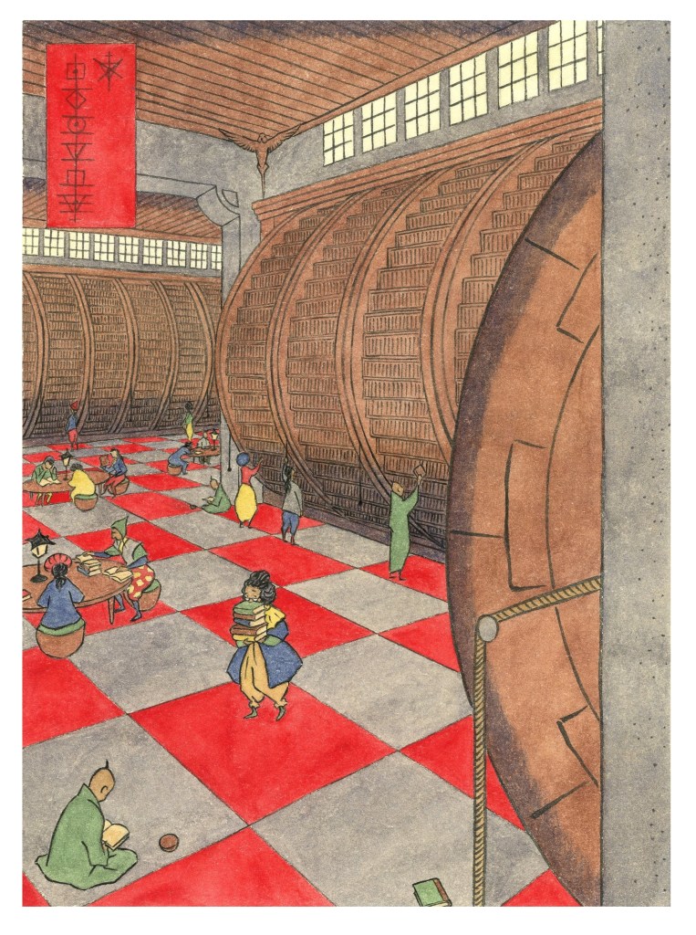 The Imperial Library in the Kaduyorma (See n. 4) holds the largest collection of books in all of the empire. Indeed, it is supposed to house all of the books ever published in the imperial domains since the advent there of the first printing presses, some seven hundred years ago. For ease of consultation, most of the books are housed on tarotukeh (“book-mills”), enormous wooden wheels mounted with bookshelves. Each individual bookshelf is attached in such a way that, as the tarotukeh is turned, they always remain upright, in much the same way as the chairs in a panoramic pleasure wheel. Pulling on a chord that hangs at the side of each tarotukeh engages the gears that cause the wheel to rotate, allowing library users to easily scroll down from one row of books to the next, without even needing to adjust their eye level.