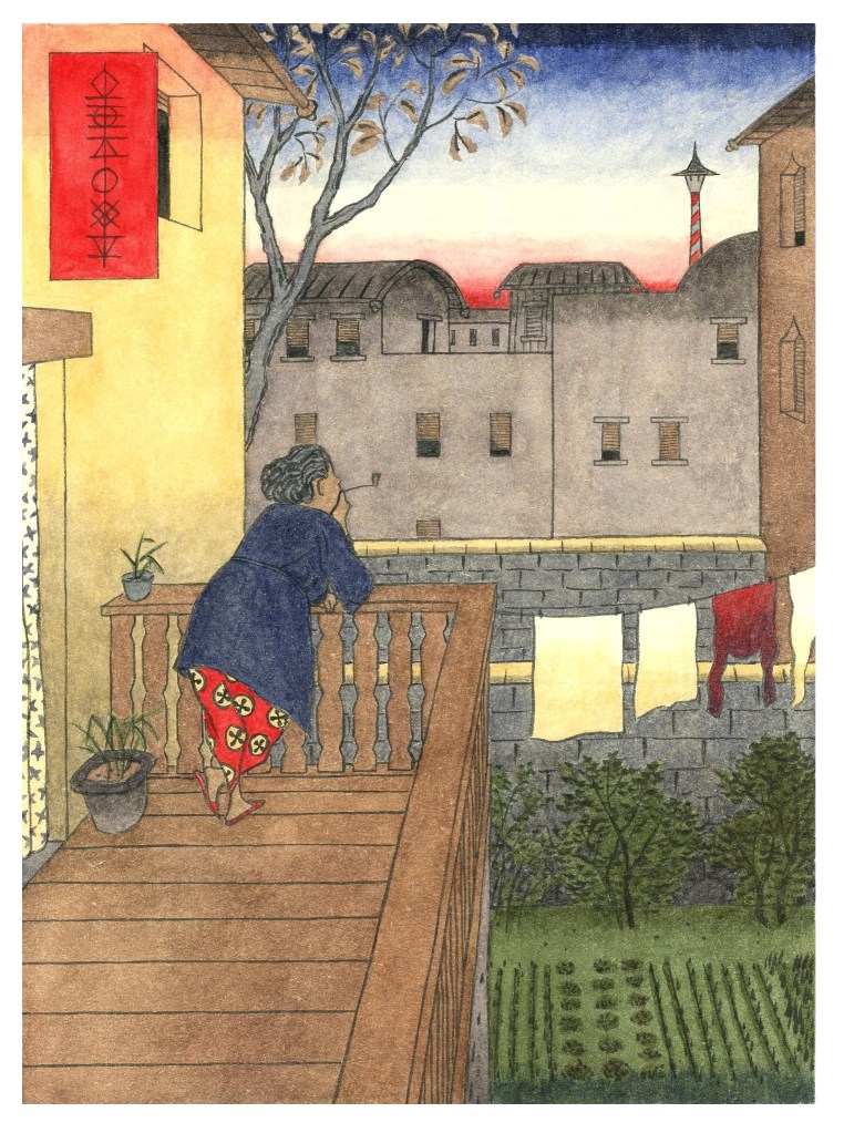 In the end, it may also be that Sensukans find a strange comfort in the idea that there is some unknown figure watching over their lives. When one looks up towards the Orepi Tower—perhaps, like the woman in this print, while having a solitary evening smoke upon one’s balcony—the tower sometimes gives the impression that it is looking back. This can serve as a reminder that one is never completely alone, never completely insignificant. In the eyes of the state, at least, one exists. One is a person of interest, even. A file was opened on one long ago, and one has not been forgotten.