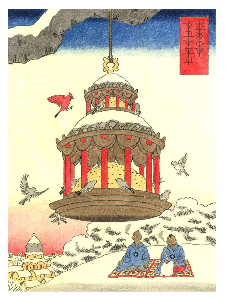 In Sensuka, the Liùkhites’ conversion efforts are largely directed at birds, for which they build intricately carved miniature wooden temples. These structures are then suspended from the boughs of trees and filled with seeds, so as to entice the birds inside. The two men sitting cross-legged on a carpet and looking up intently at the dimadini are two Liùkhite devotees. They have been appointed with the task of determining exactly how many individual birds attend this place of worship on a regular basis. These they will then enumerate as official converts in their sacred records. To those amused Sensukans who point out that the birds are clearly only visiting the dimadini for the seeds, the Liùkhites reply that religion must always endeavor to meet individuals on their own terms.
