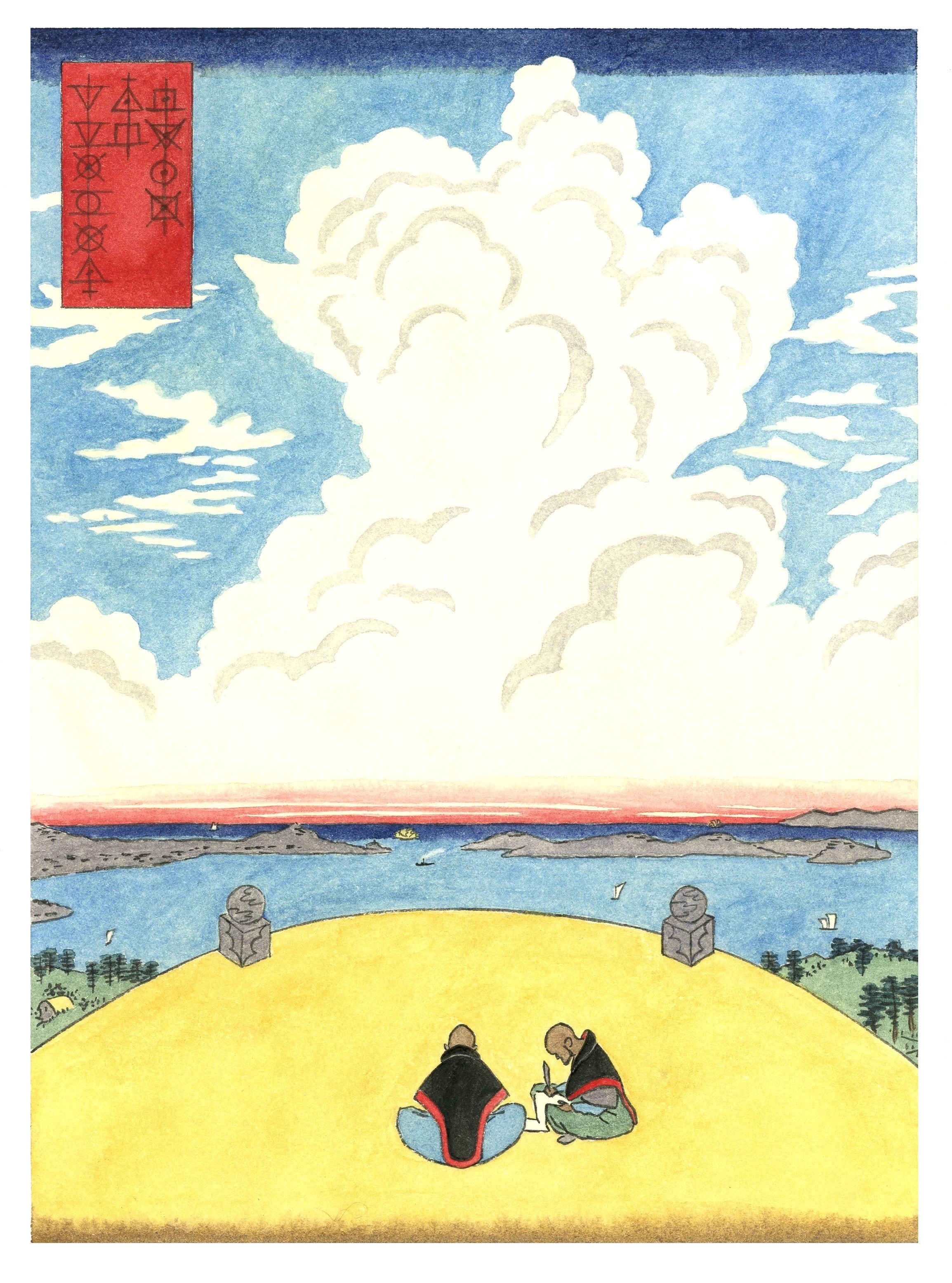 Owing to the number of variables involved, cloud divination is one of the most difficult of the prophetic arts. It is consequently the exclusive purview of a caste of specially trained priests. Though their “readings” of clouds can theoretically be carried out from any vantage point, there are certain sites that are held to be especially propitious to this purpose. In Sensuka, official cloud prophecies are always obtained from the cloud temple atop the hill of Marikora, at the city’s northwestern limits. The actual viewing of clouds takes place on a raised circular platform at the front of the temple, overlooking the Bay of Rilito. At an appointed time each day, a temple priest will take a seat at the centre of the platform. He will remain there for a period of up to several hours, dictating all significant observations to a scribe sitting beside him. These nephomantic annotations are then brought to the other temple priests, who set about properly interpreting them.