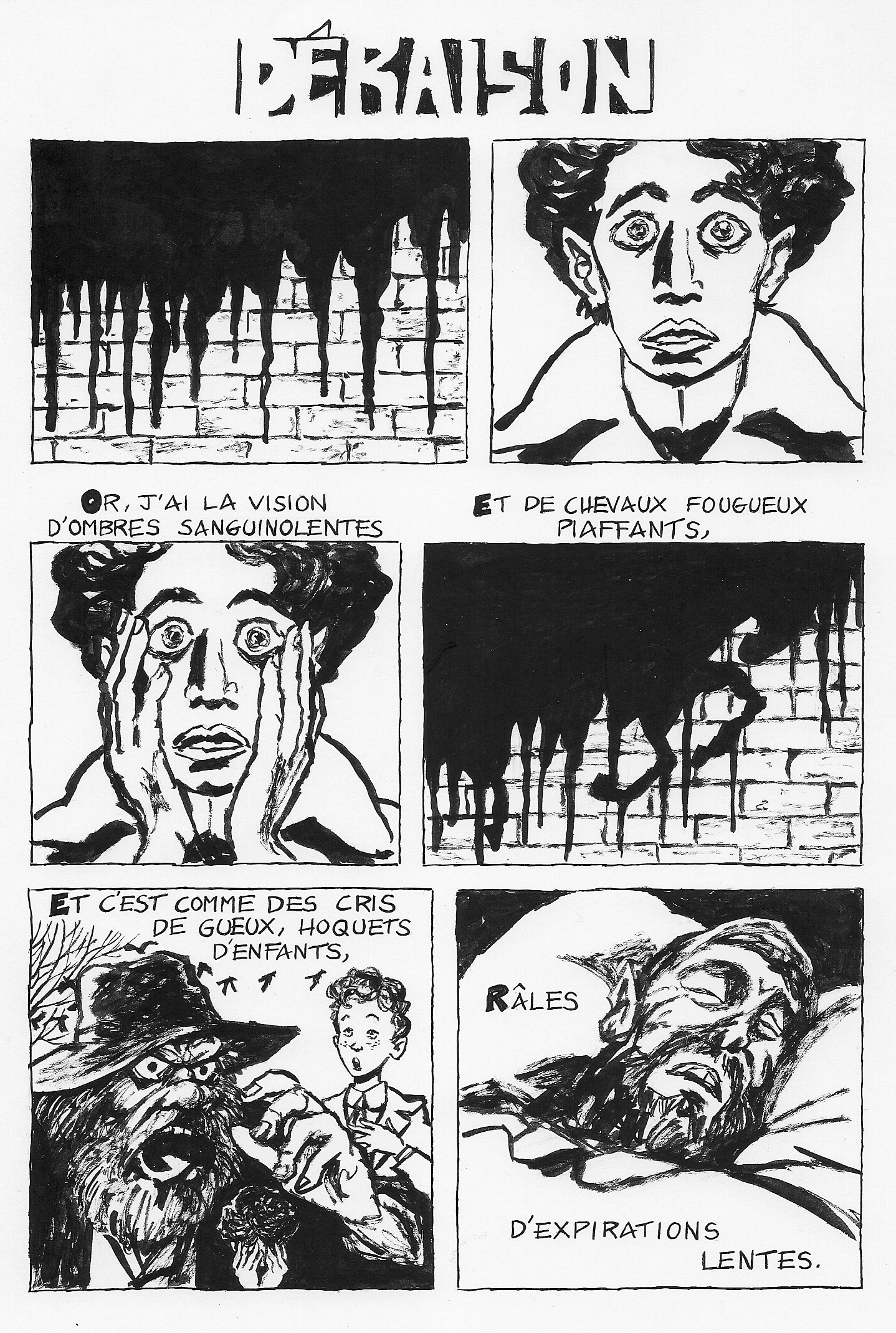 My comic-book adaptations of the poems “Déraison”(“Insanity”) and “Le fou” (“The Madman”) by Émile Nelligan (1899). (click on images to enlarge)