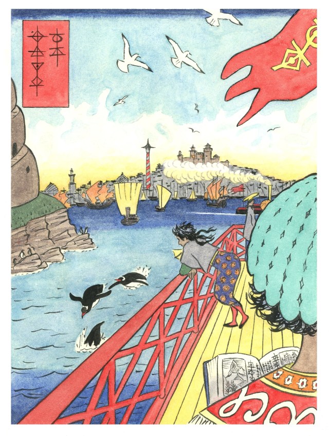 This is the moment, for all sea vessels approaching Sensuka from the west, in which the city’s spectacular natural harbour first comes into view. Spread out before us at the far end of the bay is the densely built-up peninsula of Orepi, which juts out into the harbour by the mouth of the Juminta River. Orepi’s famous spiral tower rises from the warehouses and the forest of masts lining the area’s bustling harbourfront. Lomuku Castle—the city’s most iconic building, along with the Orepi Tower and the Sakalumi Lighthouse—dominates the city centre from its perch atop Labetachi Hill. Directly ahead of the ferryboat, another steamer ferry is moving in the opposite direction, away from the port. The placement of the column of smoke rising from its chimneystack makes the Lomuku appear to be floating in the air. This is a no doubt intended as a nod to the castle’s name, which means “cloud.” Continue reading
